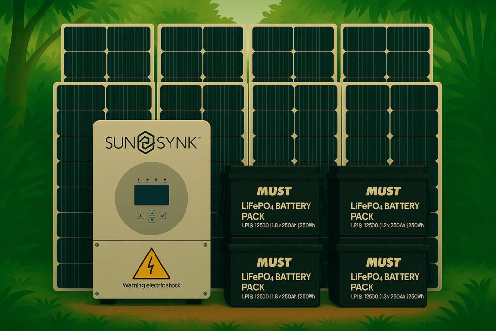 Ce kit solaire haute puissance vous permet d’alimenter l’ensemble de votre maison ou carbet, y compris un climatiseur, Frigo, congélateur, ventilateurs, éclairage LED, télé, box internet, machine à laver, micro-ondes, outillage électrique, pompe à eau et climatisation split peuvent fonctionner ensemble sans surcharge. Grâce à sa batterie lithium de 10 kWh, ses 10 panneaux solaires de 585 W et son onduleur hybride Sunsynk 5kW, ce kit est pensé pour offrir confort, autonomie et performance,